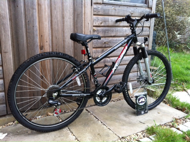 14" frame, 26" wheel, 21 gears Shimano, Tourney, disc brake front , V-brake rear, forked suspension (front wheel).